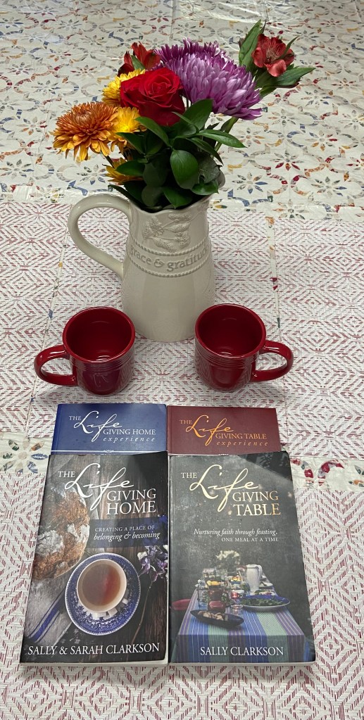 I remember growing up and always having people over for Thanksgiving. My dad was in the Air Force and would invite the people in the shop over if they didn’t have anywhere to go. I remember when we lived in England boiling 20 pounds of potatoes for mashed potatoes. I was supposed to make the gravy and it was a horrible disaster. Whatever was in the pan looked like it was going to come alive and eat us at any moment. Thankfully I have learned how to make gravy since then. But a love of entertaining friends and strangers was instilled in me. My husband grew up in a similar way. We both love having friends over for dinner and hosting church functions. My husband is an amazing cook, and I’m really good at making coffee so we have the basics covered. 🙂 Recently I have found an author who I really wish I had found earlier on in life. Sally Clarkson and her husband, Clay, started Whole Heart Ministries in the 90’s and has grown tremendously. Sally wrote her first book “Seasons of A Mother’s Heart” in 1996.In 2016 she started Mom Heart Groups, MomHeart.com, there are groups almost all over the whole world now. She has over 20 books that all range from motherhood to hospitality to friendships. I gifted myself 3 of her books one year, “The Life Giving Home,” “The Life Giving Home Experience,” “The Life Giving Table,” “The Life Giving Table Experience,” and “Own Your Life,” which I haven’t read yet. The two Life Giving books were eye opening and so well done. “The Life Giving Table Experience” was written with her son Joel and his wife Joy, and “The Life Giving Home” was written with her daughter Sarah with Joel co-authoring the “The Life Giving Home Experience.” Through both of these books Sally describes how she grew up, moving and having people over all the time. She shares how her and her husband would have people over that they just met. She also talks about how her children would be there to help, invite friends, and be a part of the whole evening. She also talks about about how things aren’t always perfect, and really emphasizes that even just having a mom friend over for a cup of coffee or tea with cookies is sometimes just what we or they need.
